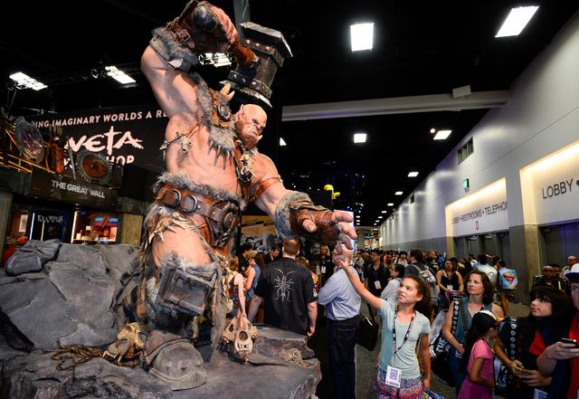 在美国加利福尼亚州的圣迭戈,一名动漫爱好者触摸网络游戏《魔兽世界》中的人物原型塑像。