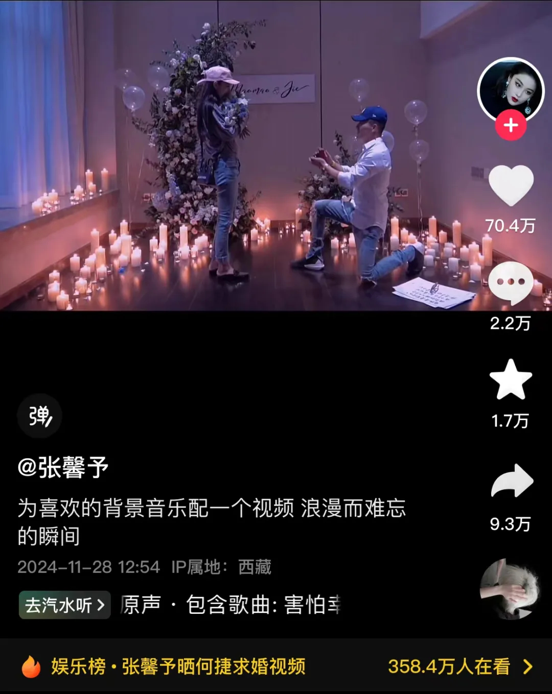 在这段视频中,何捷单膝跪地向张馨予缓缓打开求婚戒指,场景进行了精心设计,目前该视频的点赞量已超过70万。