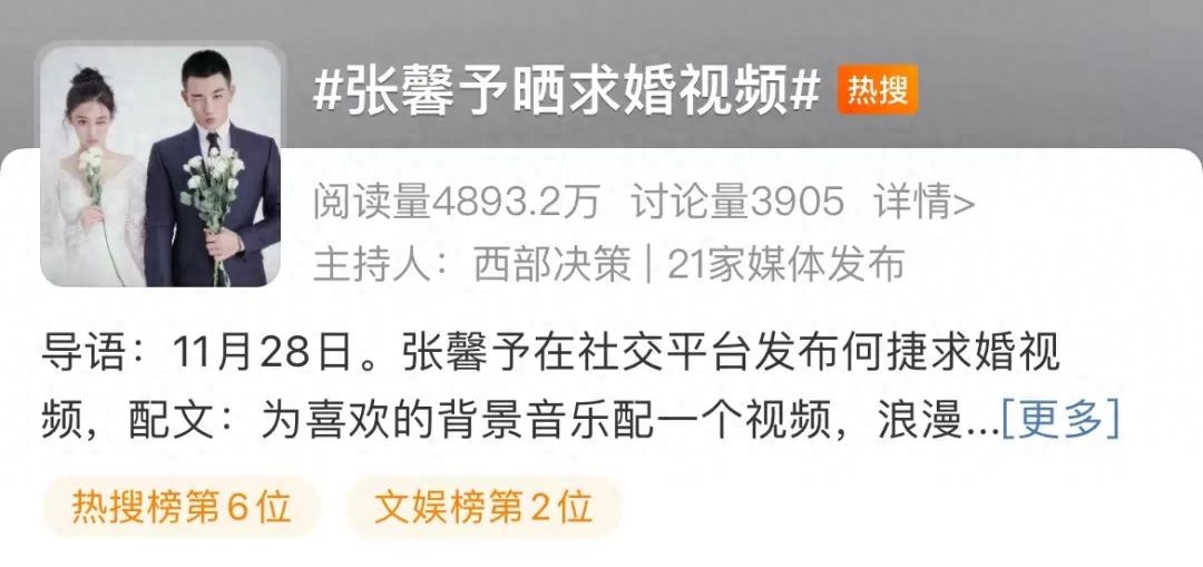 11月28日,张馨予在社交平台发布何捷求婚视频,配文:为喜欢的背景音乐配一个视频,浪漫而难忘的瞬间,引起网友热议。