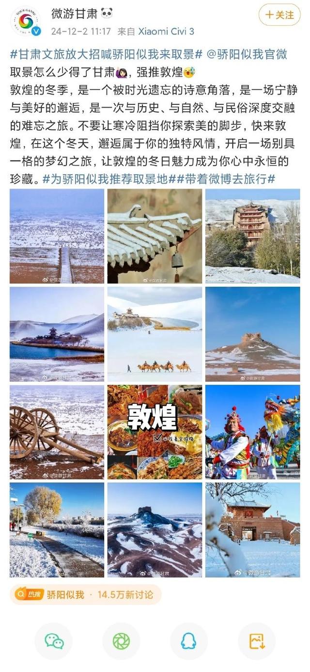 值得一提的是,作为一部从筹备起就备受关注的顶级IP改编作品,《骄阳似我》的开机引发了各地文旅单位的积极关注与互动。江苏文旅、甘肃文旅等十余家文旅单位隔空喊话,邀请剧组到各地取景拍摄,排面十足。