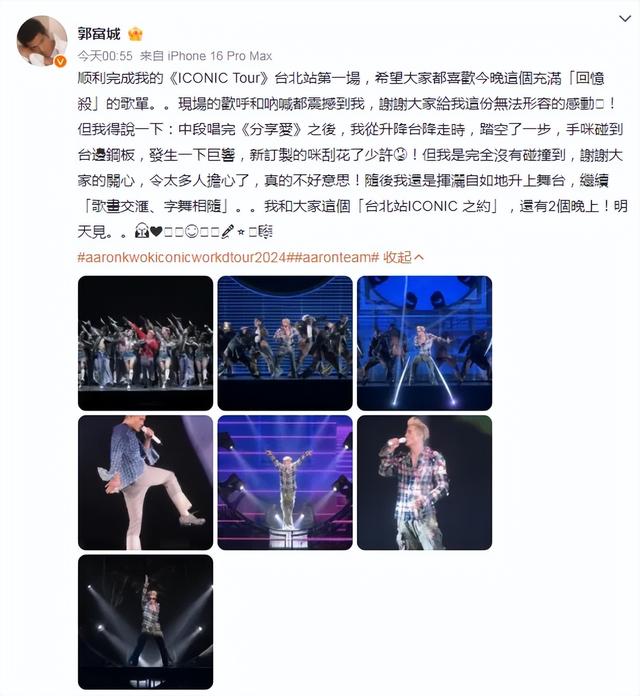 12月27日晚,59岁的郭富城在台北小巨蛋举行巡回演唱会,当唱到《分享爱》时,他意外跌落舞台,还发出巨响,让现场歌迷非常担心。
