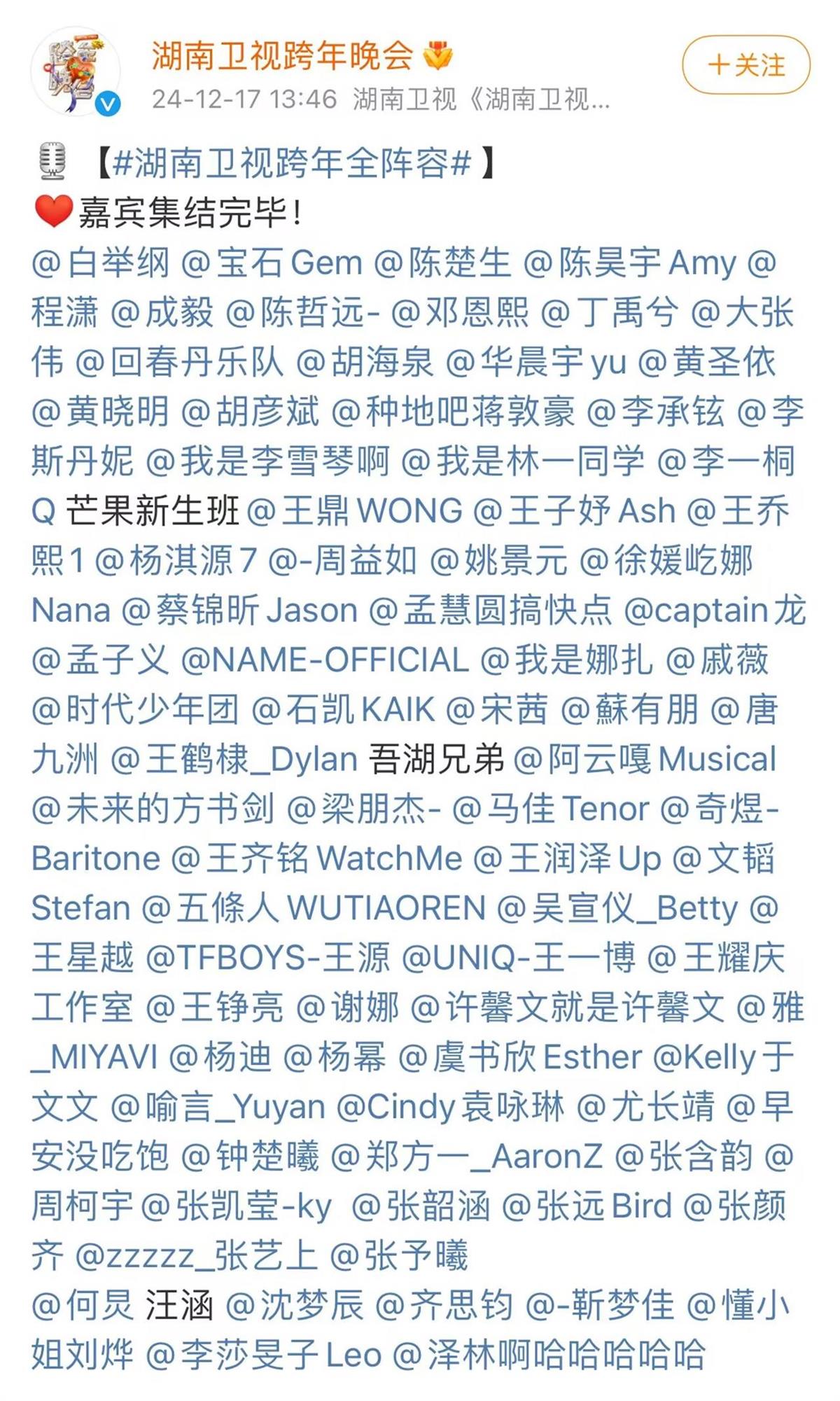 12月31日下午1:49,湖南卫视2024-2025跨年晚会节目单正式出炉,极目新闻记者发现,12月17日就曾在官宣阵容里出现的歌手宝石老舅,已经不在节目单中。