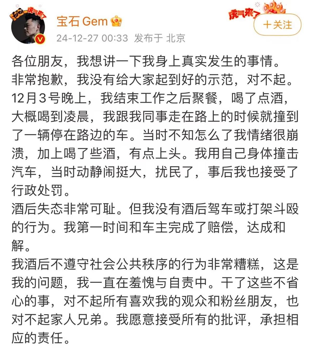 12月27日凌晨,宝石老舅在微博发文提到,12月3日晚,自己因酒后情绪崩溃,在撞到一辆停在路边的车之后“有点上头”,“我用自己的身体撞击汽车,当时动静闹得挺大,扰民了,事后我也接受了行政处罚。”