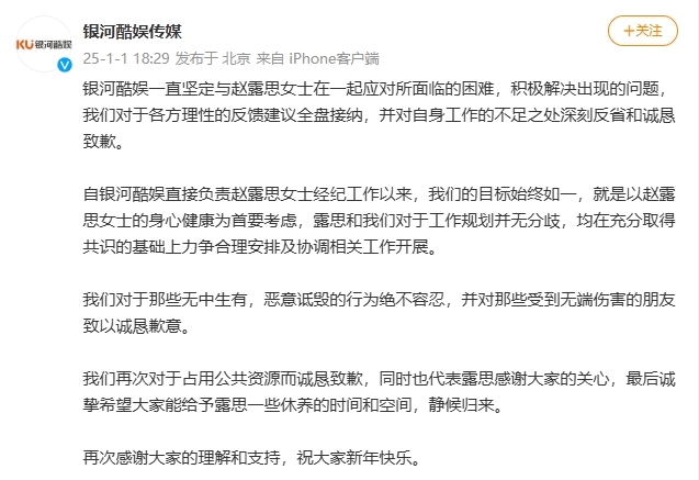 1月1日晚,赵露思经纪公司@银河酷娱传媒 发文:银河酷娱一直坚定与赵露思女士在一起应对所面临的困难,积极解决出现的问题,我们对于各方理性的反馈建议全盘接纳,并对自身工作的不足之处深刻反省和诚恳致歉。此前赵露思发长文公布病情,称“重视心理治疗真的很重要”。