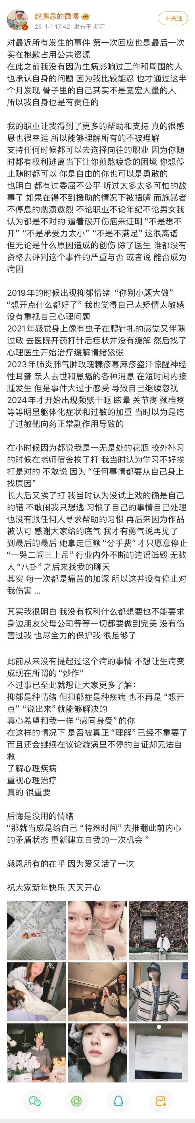 此前,1月1日,赵露思发长文表示2019年的时候自己出现抑郁情绪,2021年感觉身上像有虫子在爬针扎的感觉又伴随过敏,2024年才开始出现频繁干呕、眩晕、关节疼、颈椎疼等等明显躯体化症状和过敏的加重。