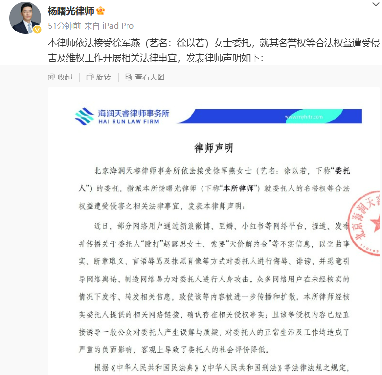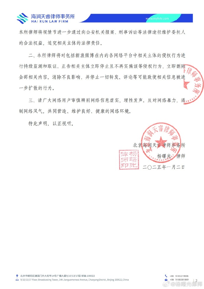 1月2日,赵露思前经纪人徐以若委托律师发声明,否认网传“殴打”赵露思、索要“天价解约金”等不实信息,“现已对相关网络用户的侵权行为完成取证,将视情节通过向公安机关报案、刑事诉讼等法律途径维护委托人的合法权益。”