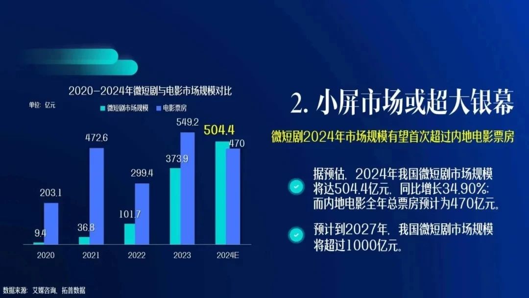 站在新年伊始,回望过去一年,国内微短剧的发展经历了从无序到规范、从粗糙到精品、从小众到大众的过程。《中国微短剧行业发展白皮书(2024)》显示,2024年我国微短剧市场规模将达504.4亿元,同比增长34.90%,预计2027年达到1000亿元。