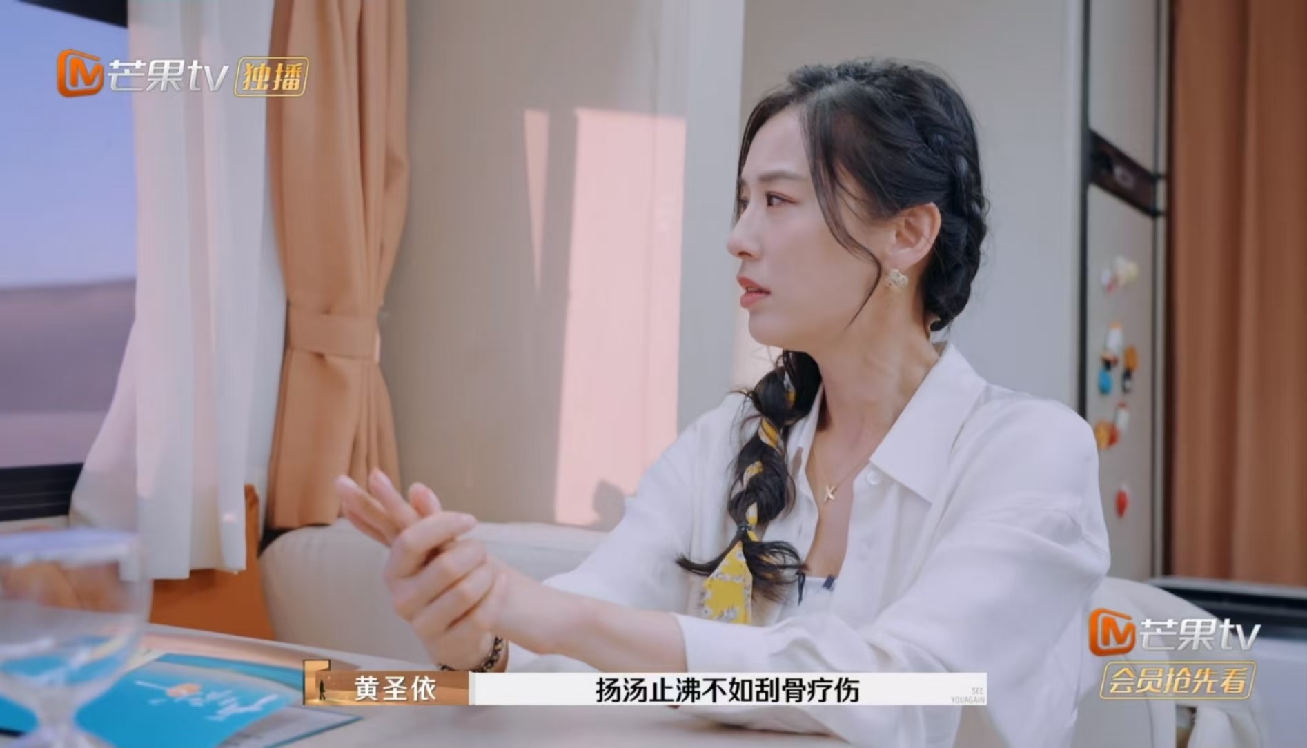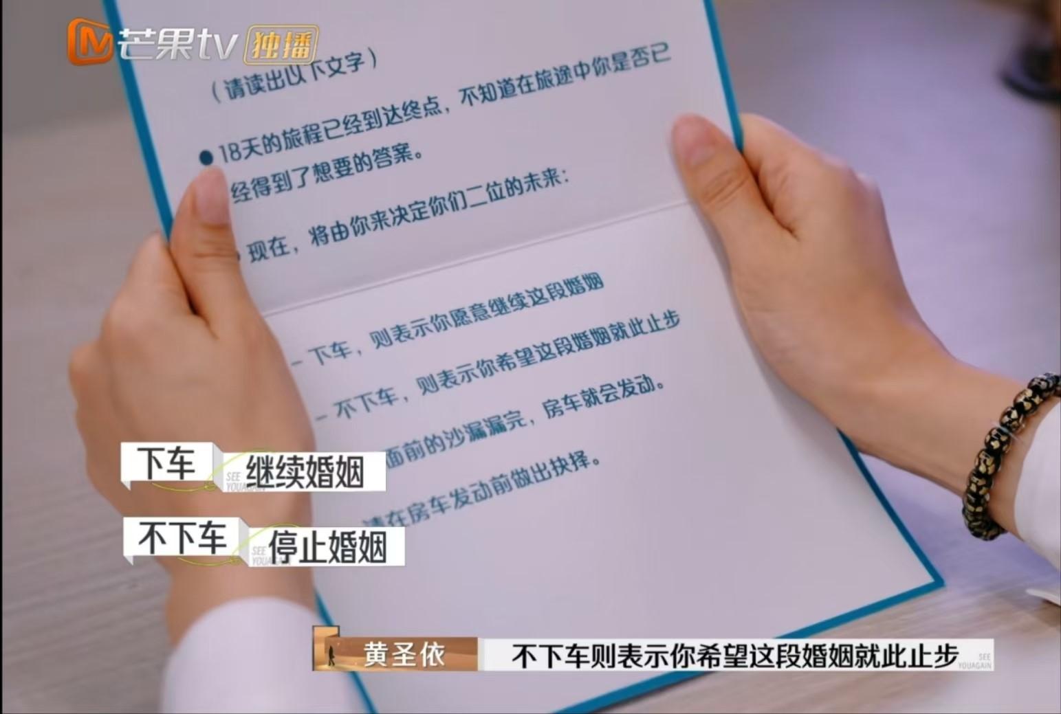 节目中的选择是演戏还是真实的世界?黄圣依自问是真实的,更像此刻的感受和人生到这个旅途应该做的决定。“我觉得扬汤止沸不如刮骨疗伤,刮骨疗伤的过程是痛苦的,但肯定要经历这样的痛苦,才可以在心理上和行动上给自己一个崭新的开始。决定不下车的那一刻,一切就要重新开始。不要试图在婚姻里面去依赖对方,还是要掌控在自己手里,自己才是人生的主宰。我希望在四十岁的时候打开自己,真正成为自己想要成为的样子。”