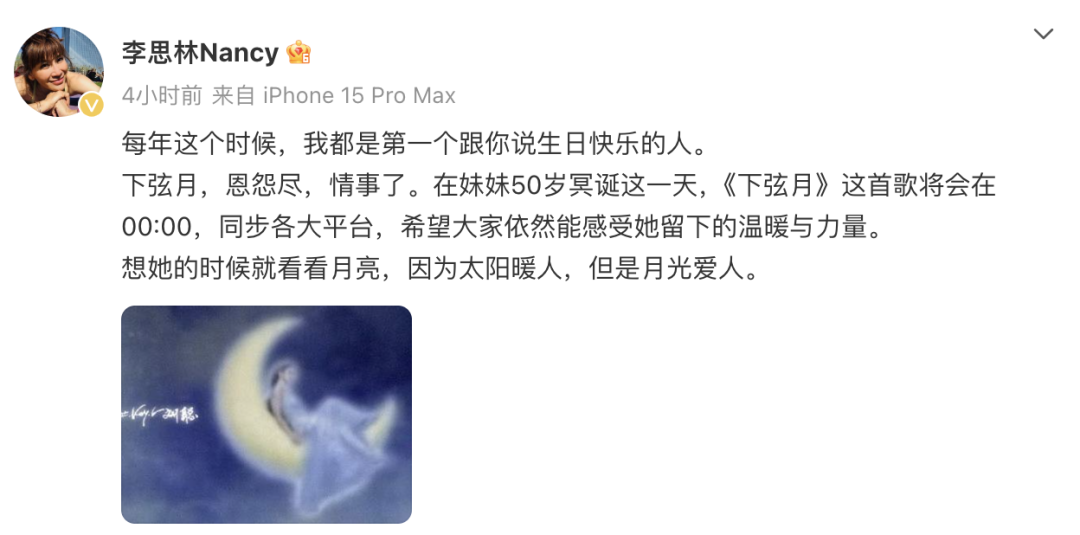 “每年这个时候,我都是第一个跟你说生日快乐的人。下弦月,恩怨尽,情事了。在妹妹50岁冥诞这一天,《下弦月》这首歌将会在00:00,同步各大平台,希望大家依然能感受她留下的温暖与力量。”