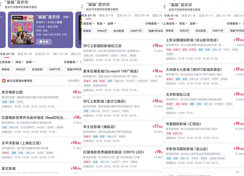 1月15日,上海部分影院《“骗骗”喜欢你》票价。淘票票截图