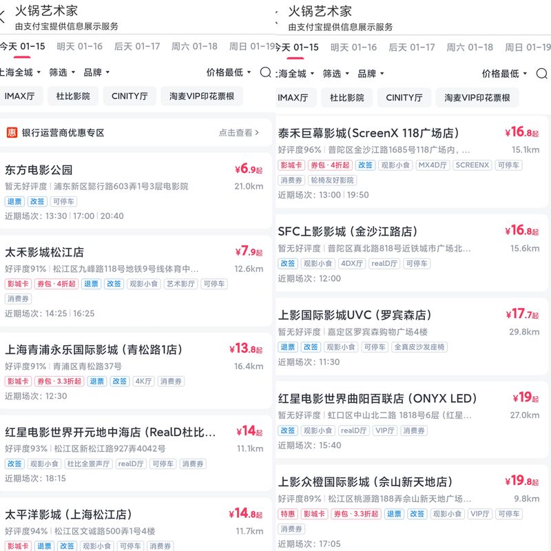 1月15日,上海部分影院《火锅艺术家》票价。淘票票截图