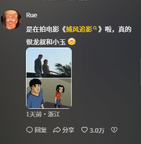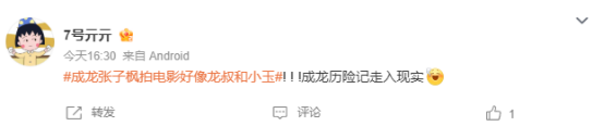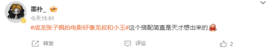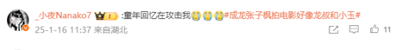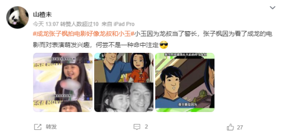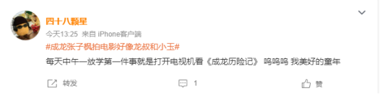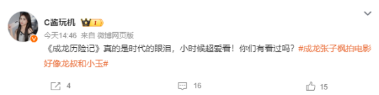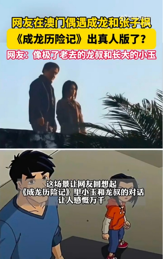 不过更多网友感慨,成龙的张子枫的组合完美还原了经典动画片《成龙历险记》中,成龙和小玉的叔侄组合。张子枫本人也在早期的采访中说称自己因为看了成龙大哥的电影而对表演产生兴趣,更让观众觉得他们就是动画中的角色走进现实。很多网友也在评论区怀念起自己的童年时光。
