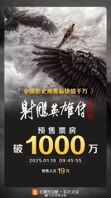 据灯塔专业版,2025年春节档今日开启预售,仅用时40分钟,档期预售总票房突破1000万,刷新中国影史预售最快破千万纪录。影片《射雕英雄传:侠之大者》开启预售45分钟,预售票房突破1000万,超过《唐人街探案3》(用时46分46秒)。