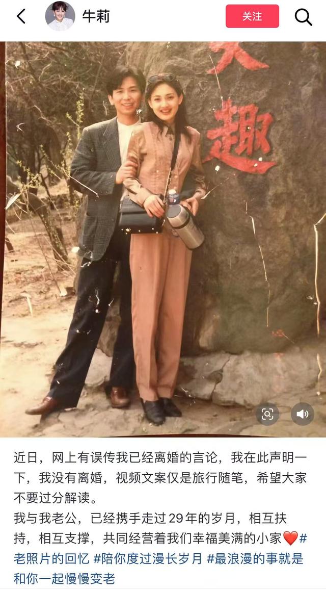 1月18日,牛莉社交账号发文否认离婚:“近日,网上有误传我已经离婚的言论,我在此声明一下,我没有离婚,视频文案仅是旅行随笔,希望大家不要过分解读,我与我老公已经携手走过29年的岁月,互相扶持,互相支撑,共同经营着我们幸福美满的小家。”