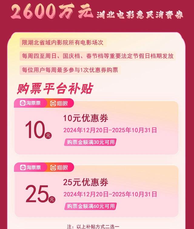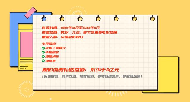 2024年12月9日至2025年2月28日,用户可通过淘票票App、微信淘票票小程序、支付宝淘票票小程序、淘宝淘票票小程序首页“全国电影惠民消费季”或“政府补贴”进入活动专题页领取5—50元红包,并且同时可享受淘票票买一赠一、淘麦VIP积分礼包、88VIP全年观影优惠券、影迷月活动。
