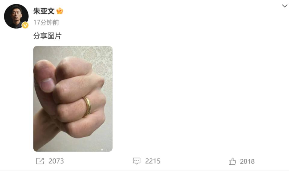 21日晚,朱亚文在社交平台晒出手握拳头戴着婚戒的照片,力破离婚传言。