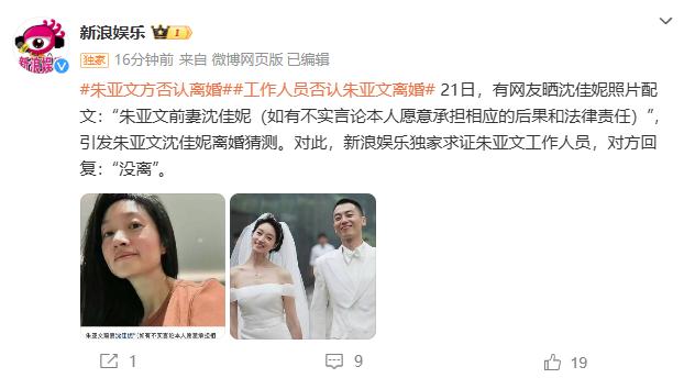 21日,有网友晒沈佳妮照片配文:“朱亚文前妻沈佳妮(如有不实言论本人愿意承担相应的后果和法律责任)”,引发朱亚文沈佳妮离婚猜测。对此,新浪娱乐求证朱亚文工作人员,对方回复:“没离”。