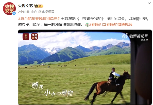 1月22日,@央视文艺官宣,由王菲演唱的歌曲《世界赠予我的》将作为总台蛇年春晚特别单曲:揽世间温柔,以深情回敬。感恩岁月赐予,每一刻都值得细细珍藏。