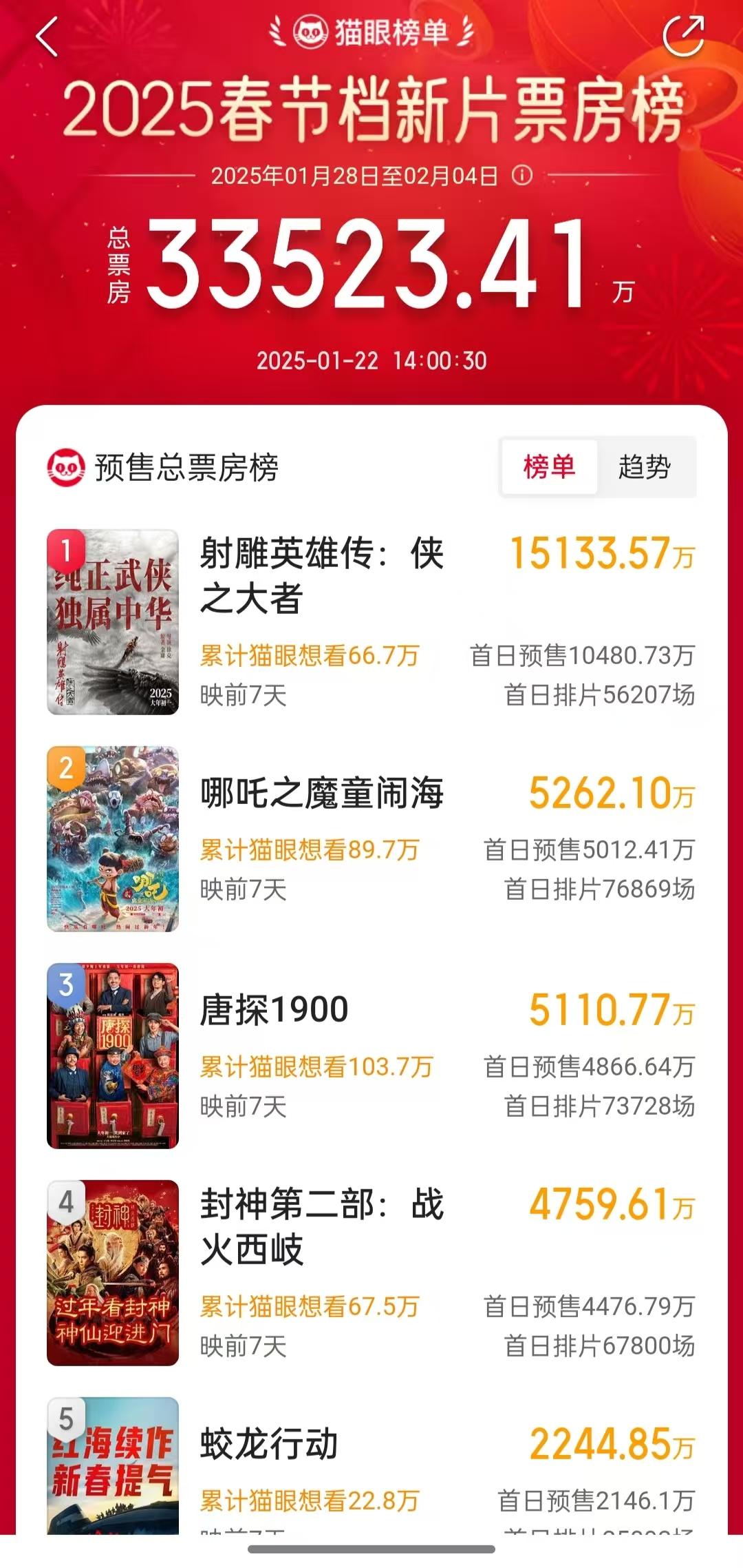 猫眼专业版数据显示,截至1月22日14时,《射雕英雄传:侠之大者》(下称《射雕》)预售总票房遥遥领先,突破1.5亿元,在预售总票房中的占比超过45%;《哪吒之魔童闹海》(下称《哪吒2》)《唐探1900》《封神第二部:战火西岐》(下称《封神2》)三部影片的预售票房差距较小,均在5000万元左右。《蛟龙行动》和《熊出没·重启未来》的预售总票房则分别超过2000万元和1000万元。