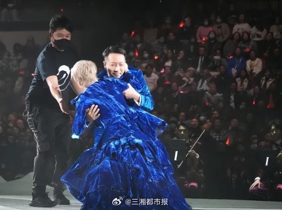 该场演唱会,陈慧娴身着深蓝色公主裙,脚踩近20厘米高跟鞋,全身心地投入演绎经典曲目《明日有明天》。表演结束后,她转身返回台中时,不慎踩到了裙脚扑倒在台上。同在舞台上的音乐人何秉舜反应迅速,将摔倒的陈慧娴扶起。