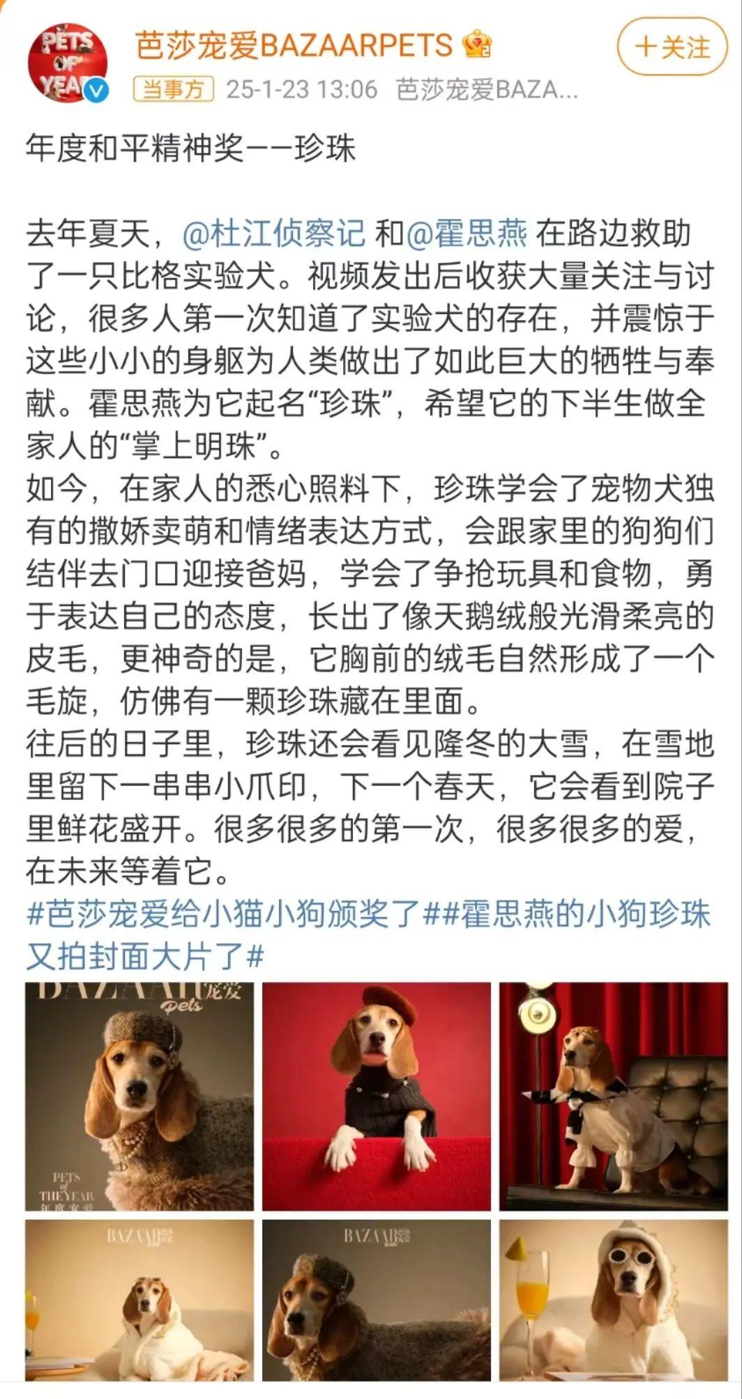 1月23日,杜江和霍思燕收养的实验犬珍珠在首届芭莎宠爱 Pets of the Year 颁奖典礼上荣获年度和平精神奖。