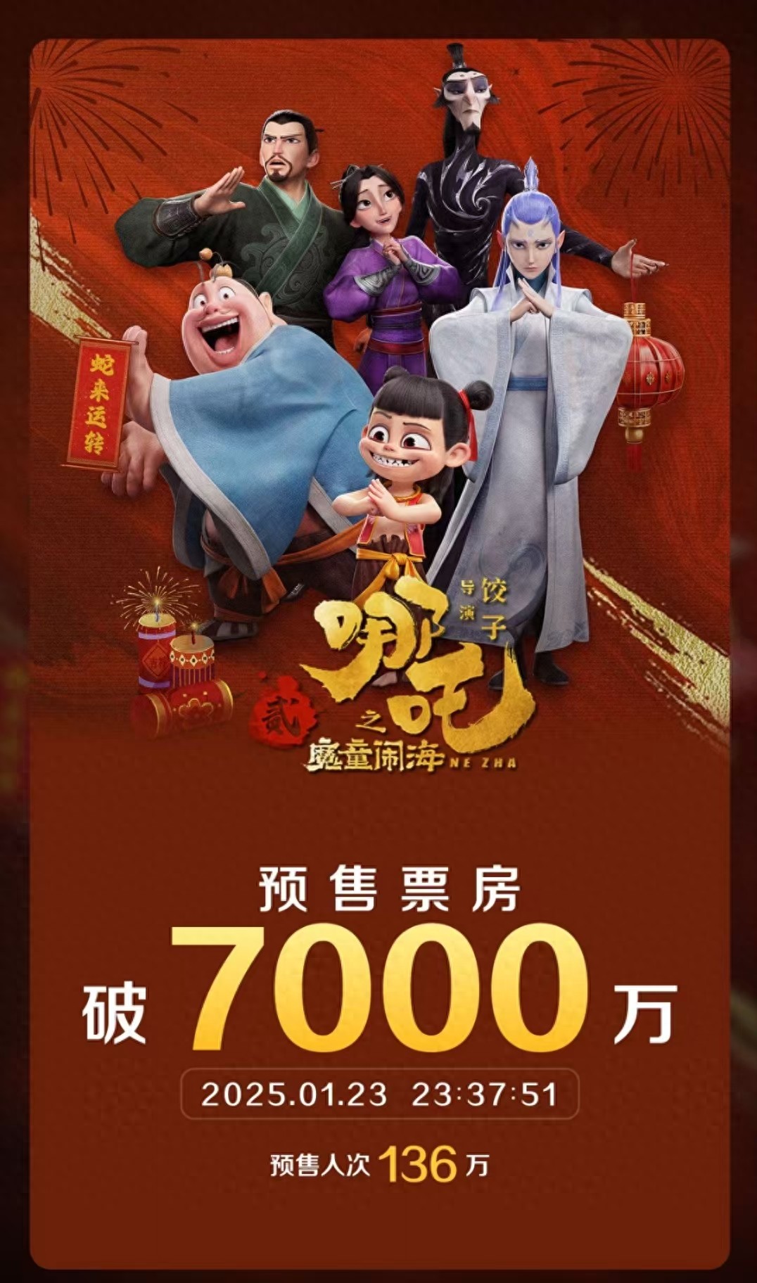 据灯塔专业版,截止1月23日23点37分,春节档电影《哪吒之魔童闹海》预售票房破7000万,预售人次136万。