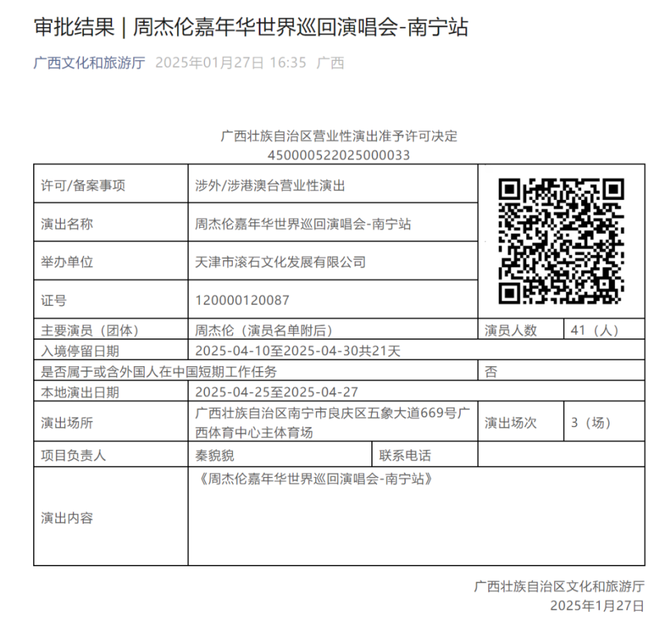 1月27日,广西文化和旅游厅微信公众号发布最新审批结果:周杰伦嘉年华世界巡回演唱会-南宁站将于4月25日至4月27日,在广西体育中心主体育场连开3场。