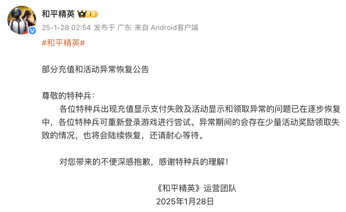 腾讯《和平精英》官方:充值显示支付失败及活动显示和领取异常问题逐步恢复中