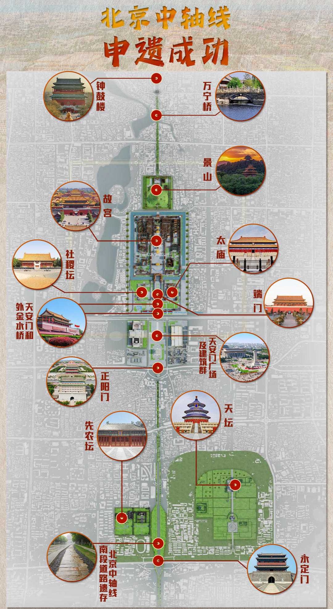 北京中轴线位于北京老城中心,全长7.8公里,始建于13世纪,是统领整个老城规划格局的建筑与遗址的组合体。北京中轴线共包含15处遗产构成要素,北起钟鼓楼,一路向南经万宁桥、景山、故宫、端门、天安门、外金水桥、天安门广场及建筑群、正阳门、中轴线南端道路遗存,至南端的永定门。太庙和社稷坛、天坛和先农坛分列中轴线东西两侧。