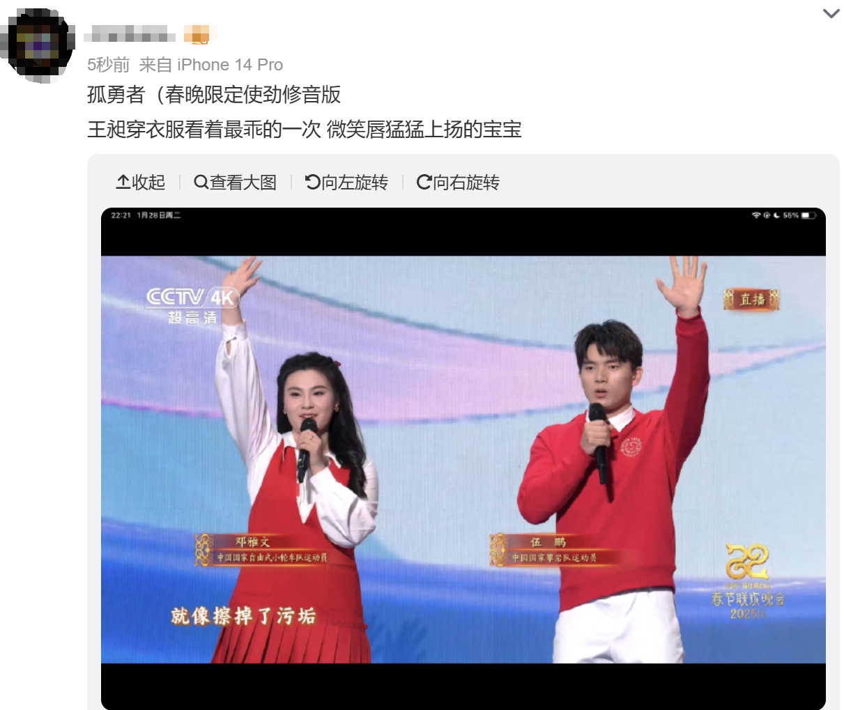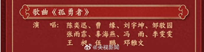 1月28日晚,在央视春晚上,伍鹏、张雨霏、曹缘等运动员,与歌手陈奕迅同台演唱《孤勇者》。