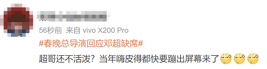#春晚总导演回应邓超缺席#话题,引起众多网友热议,网友纷纷留言:“邓超还是适合春晚的,制造笑点很多,并且自带喜感!”“没有超哥感觉春晚少了一半乐子”……