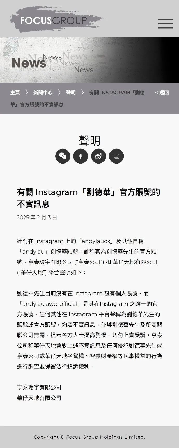 2月3日,刘德华公司发声明否认ins账号出自艺人本人及所属公司,刘德华在instagram不存在个人账号。