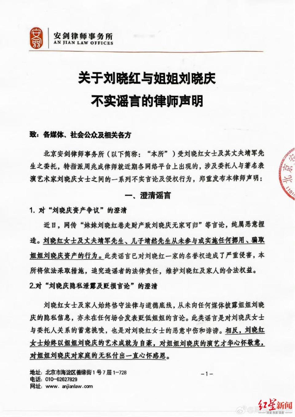 2月7日,刘晓庆同母异父的亲妹妹刘晓红,通过律师就网上的一些传闻发布《律师声明》,包括网传“妹妹刘晓红卷走财产致刘晓庆无家可归”等言论。