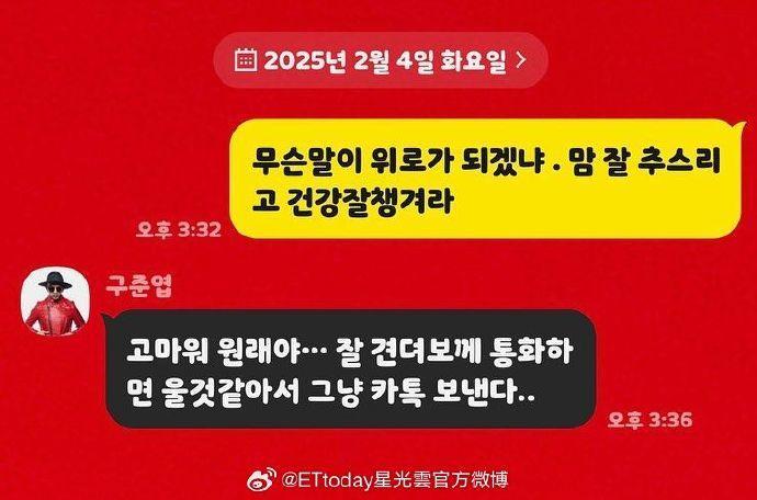 据台媒报道,酷龙队友姜元来8日透过个人Instagram公开与具俊晔的对话,透露40年好友的沉痛心情。姜元来2月4日主动发讯息安慰具俊晔:“我不知道该说什么才能让你好过一点,希望你能好好整理心情,照顾自己的健康。”,具俊晔回应:“谢谢你,元来……我会努力撑下去……如果讲电话,我可能会忍不住哭出来,所以就只发讯息了。”