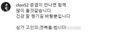 姜元来在贴文的配文写下“和俊晔见面的时候,应该会哭得很惨,我只希望他能好好照顾身体,也为故人祈福”,他也以黑底白字表示“加油啊,俊晔啊”,以及CLON经典歌曲《Kung Ddari Sha Bah Rah》 来为好友打气,期盼他能重新振作。