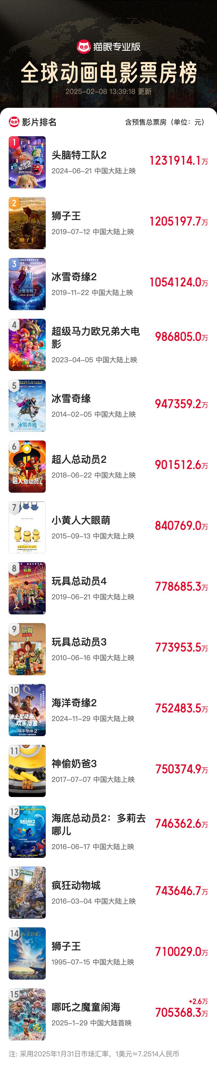 进入全球动画电影票房榜前十五!