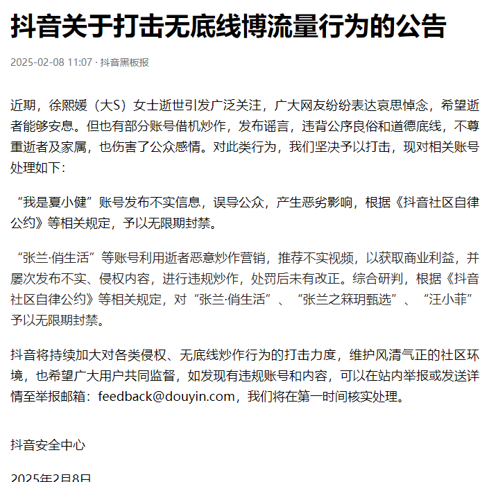 2月8日,抖音安全中心发布关于打击无底线博流量行为的公告。