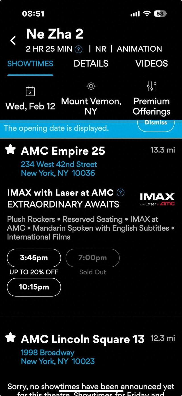 “原计划是2月14日上映的,最近档期提前了。身边很多人都在抢票。首映当天的票基本已经抢空了,只有第一排还有空位。”一位在美国纽约的华人鹿桑(化名)告诉顶端新闻记者。据其提供的电影票截图显示,12号当天部分时间段已售空,未售空时间段仅剩较偏的位置。