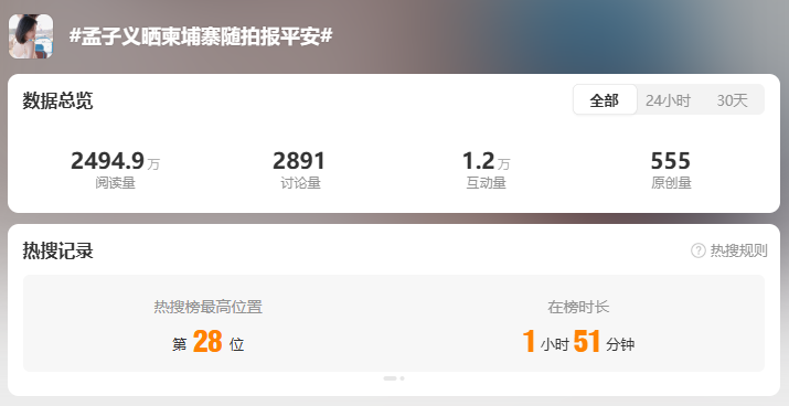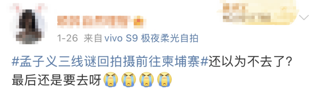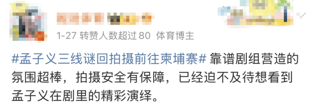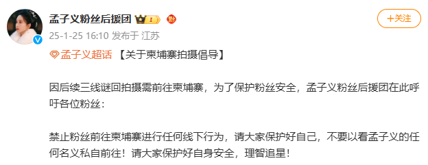 此前,孟子义后援会曾发文呼吁粉丝:禁止前往柬埔寨进行任何线下行为,请大家保护好自己,不要以看孟子义的任何名义私自前往!请大家保护好自身安全,理智追星!