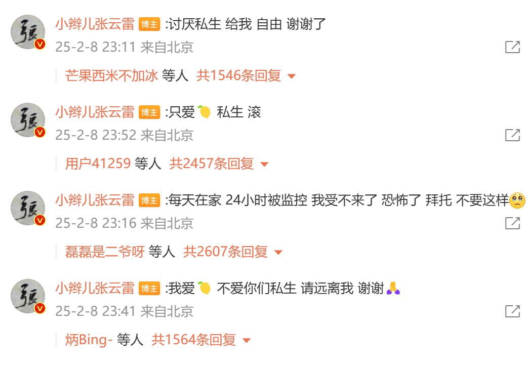 2月8日,相声演员张云雷在内容为“大年初十一,跟宝哥我家小芬儿 聚一下”的博文下连发多条评论怒斥私生饭:“讨厌私生,给我自由,谢谢了……”“每天在家24小时被监控,我受不来了,恐怖,拜托不要这样……”据悉,此前张云雷曾多次被私生饭追拍。