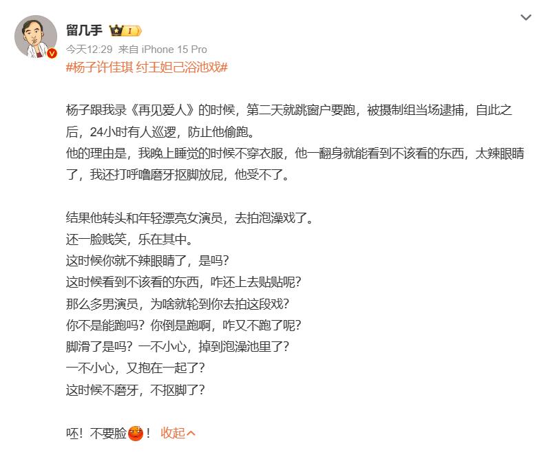 随后,刘爽通过微博发文评价了杨子演纣王这个片段,并给出了辣评:呸!不要脸!