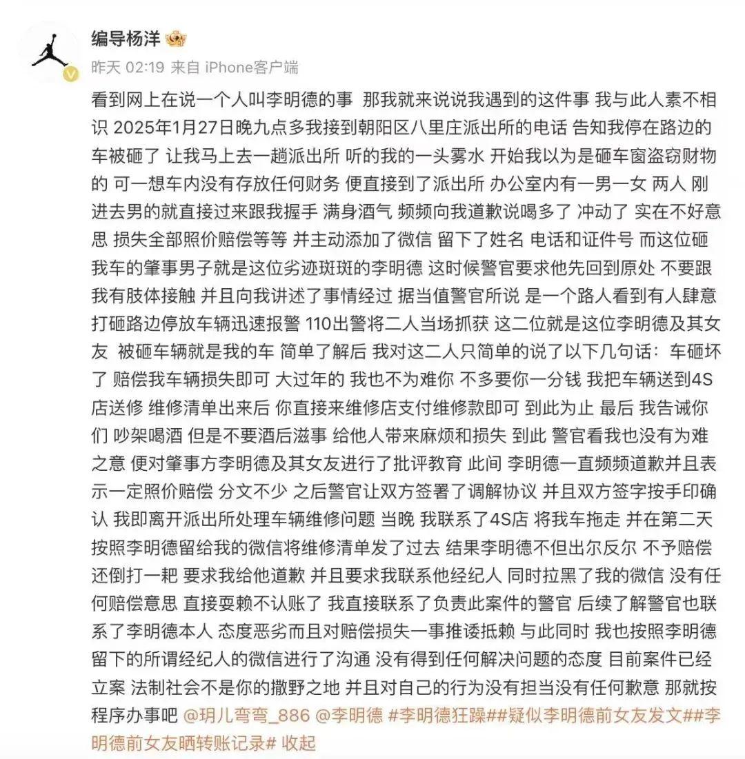 网名为“编导杨洋”的当事人称,1月27日晚9时许,他接到朝阳区八里庄派出所电话,称其停在路边的车辆被砸。赶到派出所后发现,砸车者是演员李明德及其女友。民警表示,路人目睹李明德肆意打砸车辆后报警,随后110出警将二人抓获。当时李明德满身酒气,主动向爆料人道歉,并承诺会照价赔偿车辆损失。在警官见证下,双方签署了调解协议。