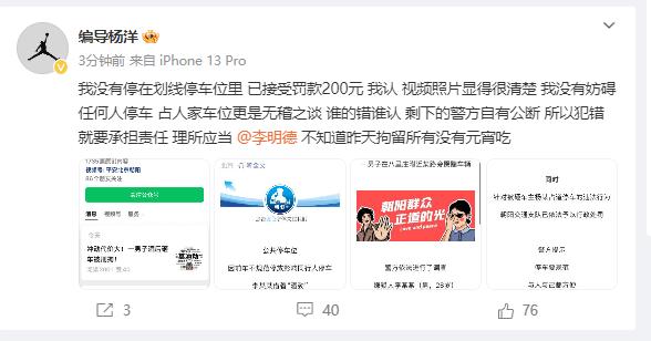 随后,当事车主@编导杨洋发布微博表示,自己没有停在划线停车位里,已接受罚款200元。“视频照片显得很清楚,我没有妨碍任何人停车,占人家车位更是无稽之谈,谁的错谁认,剩下的警方自有公断,所以犯错就要承担责任,理所应当。”