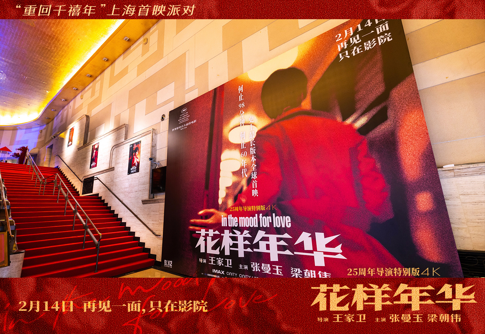 2月12日,上海大光明电影院沉浸在浓厚的电影氛围中,人流如织,影院外巨大的宣传海报和复古的横幅仿佛将观众瞬间拉回到那个充满韵味的花样年代。王家卫导演的电影《花样年华》时隔25年再度登上这方大银幕,作为“东道主”的《繁花》剧组在映后惊喜现身,被王家卫狠狠“虐”过的演员们,和观众一起分享了对花样年华的感悟。