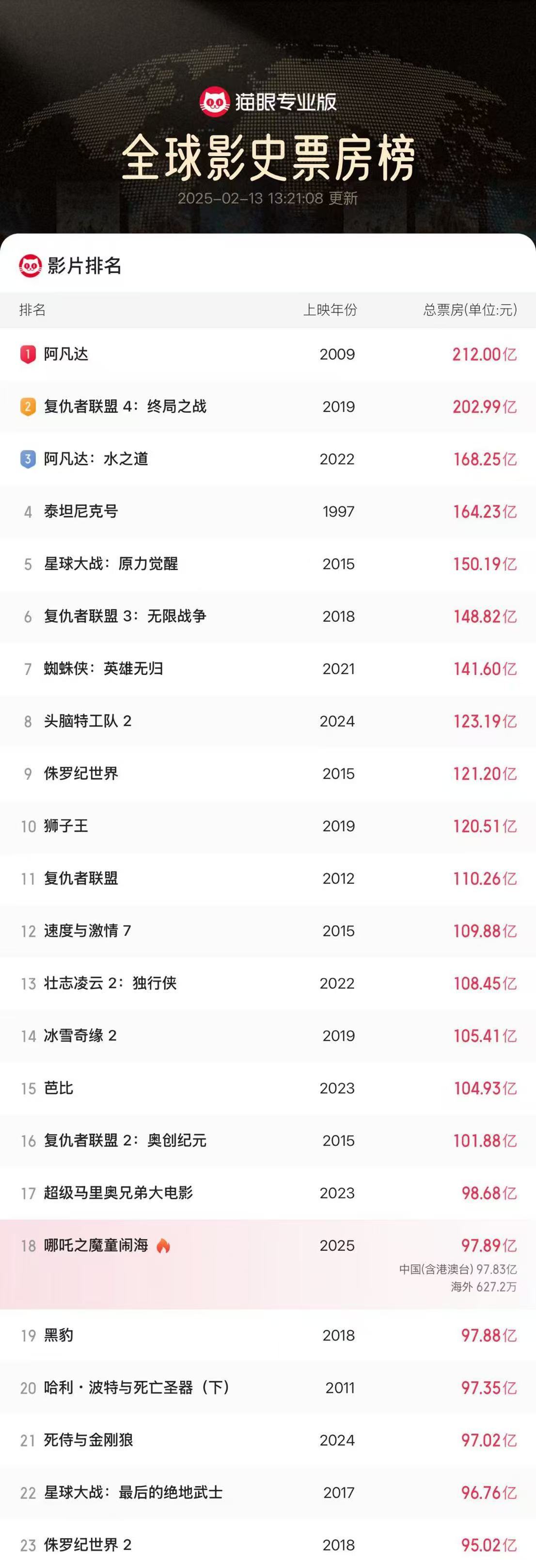 《哪吒2》冲入全球动画电影票房榜TOP4