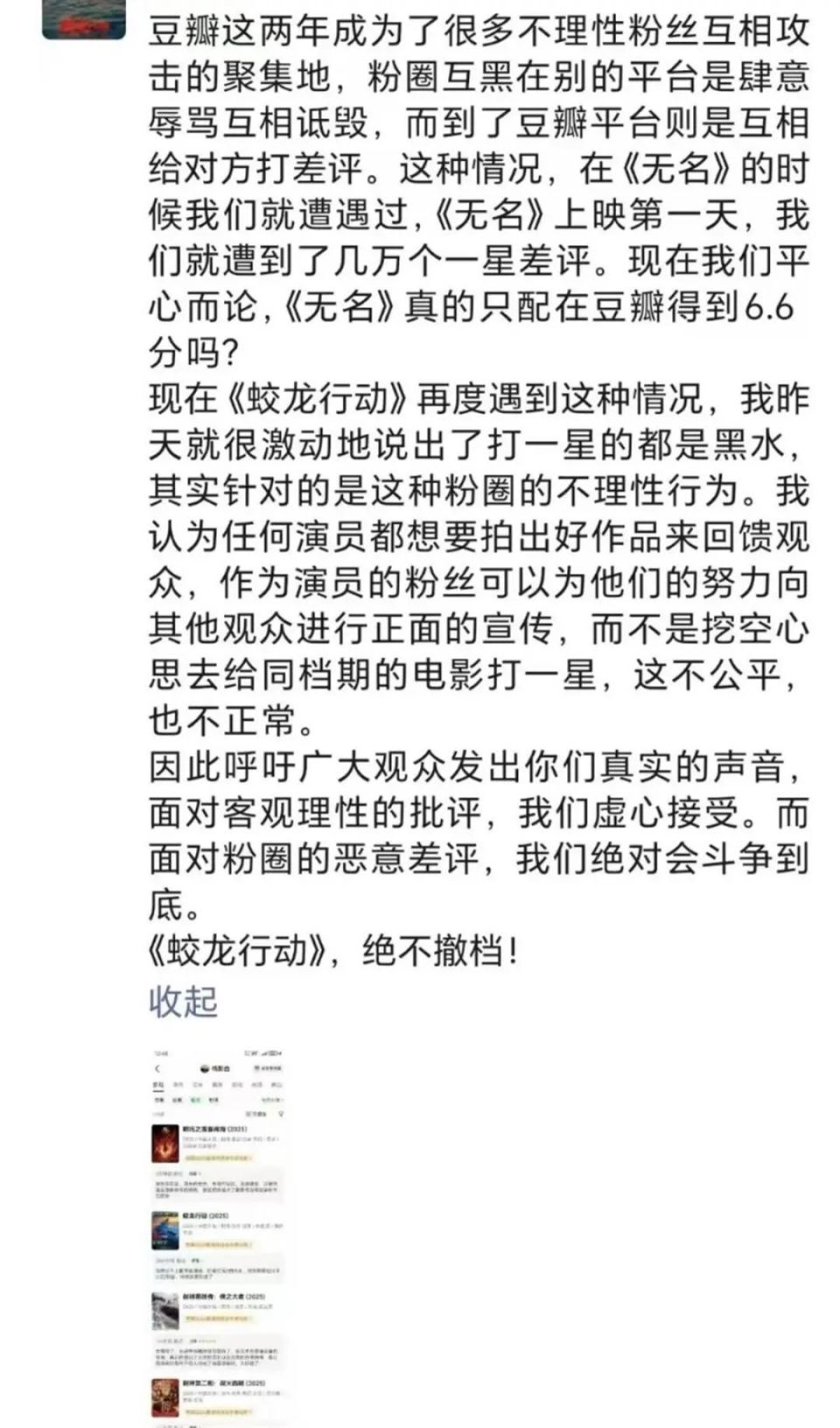 于冬呼吁观众真实评价《蛟龙行动》,“面对客观理性的批评,我们虚心接受。而面对粉圈的恶意差评,我们绝对会斗争到底。”最后,于冬强调:《蛟龙行动》绝不撤档。