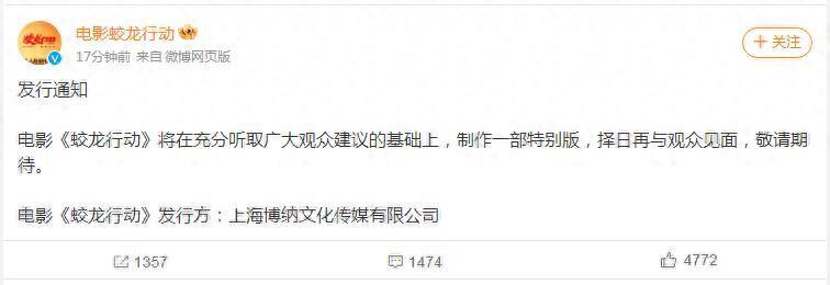 2月14日,电影《蛟龙行动》官方微博发布通知,电影《蛟龙行动》将在充分听取广大观众建议的基础上,制作一部特别版,择日再与观众见面,敬请期待。