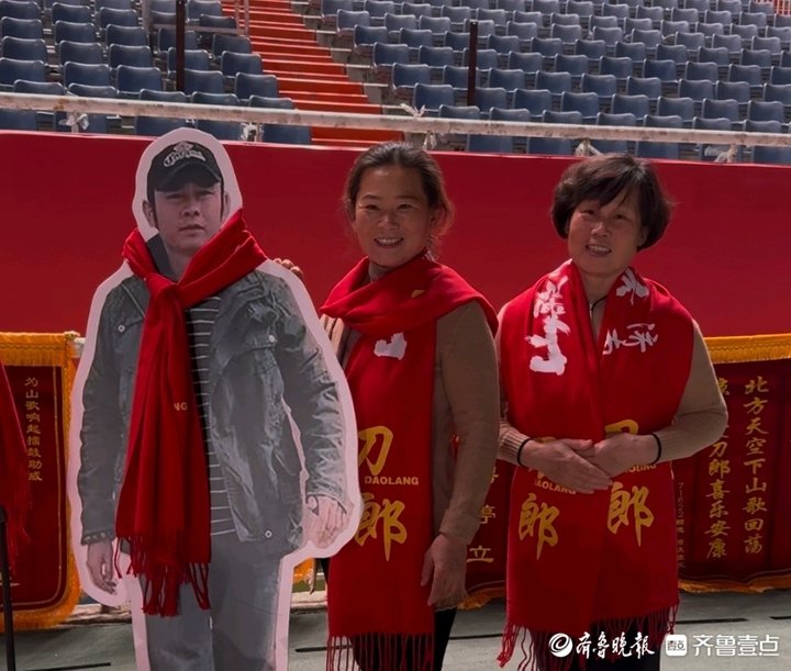 当晚7时许,济南奥体中心体育场内人气爆棚,欢笑与交谈声此起彼伏。不少乐迷手中举着自制的应援牌,身披印有刀郎名字的围巾,满脸期待与兴奋。在体育场入口旁,“刀郎”人形立牌成为粉丝热门打卡地,不少歌迷纷纷与偶像以这样特殊的方式合影留念,还有歌迷贴心地为“刀郎”戴上了“应援”围巾。