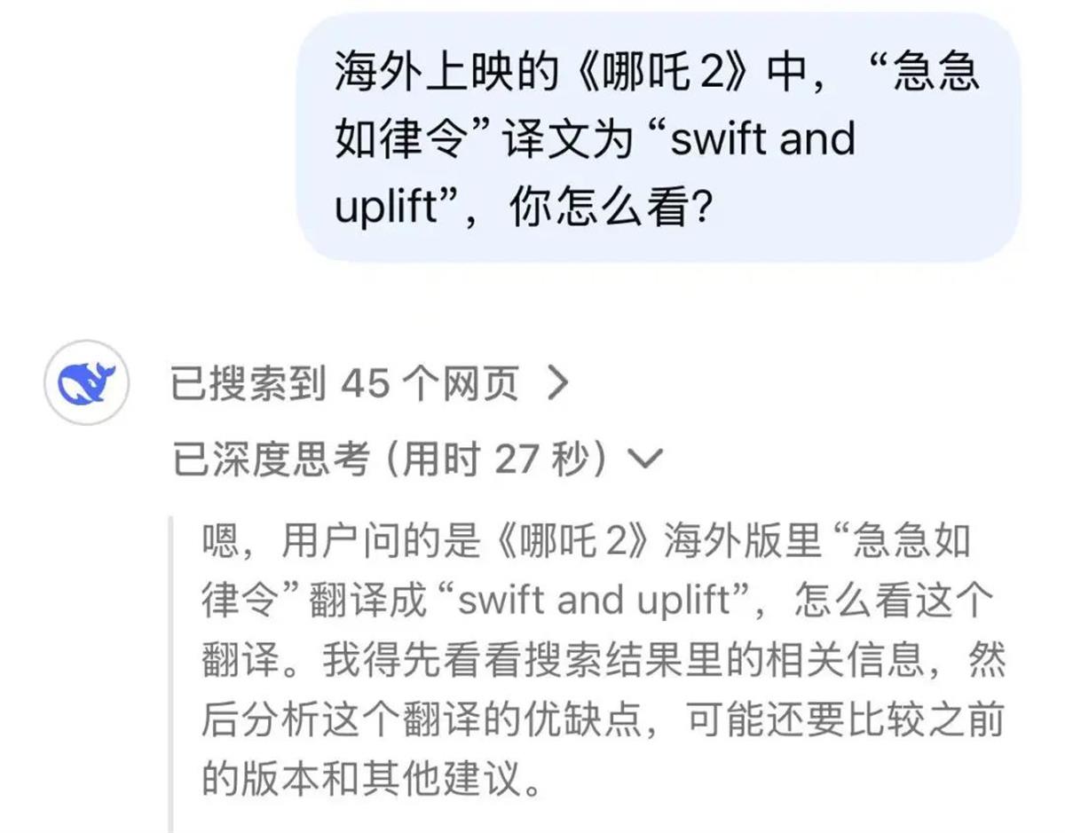 这个翻译究竟如何?记者将这一问题抛给了Deepseek。对此,Deepseek提到,原句“急急如律令”是道教咒语,兼具命令性与神秘感,要求短促有力。译文的“Swift and uplift”通过头韵强化了节奏感,同时以简洁的短语传递了“迅速”和“提升能量”的意象,符合施法场景的动态感。但是,“律令”背后的文化内涵未被充分体现。例如,若译为“Swiftly, as decreed by celestial law”(如天律般迅捷)或“Expedite! By divine order”(奉神旨加速),既能保留命令的权威性,又能融入古英语词汇以增强神秘感。