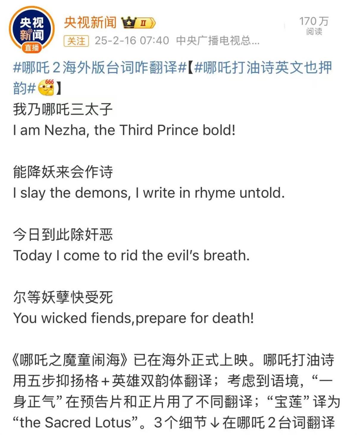 浙江大学传媒与国际文化学院研究员肖剑认为,《哪吒2》台词翻译更需要考虑的是如何契合海外青年文化,甚至可以运用一些国外俚语来打动外国群体,帮助他们更好地理解电影剧情,“翻译最佳的状态是在双方都能理解的情况之下,再去思考怎样体现中国传统文化色彩。”